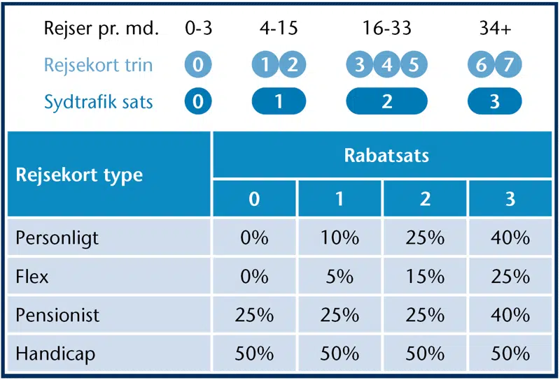 Rejsekort har otte rabattrin (trin 0-7) som i Sydtrafiks område er forenklet til tre rabatsatser (trin 0-3).