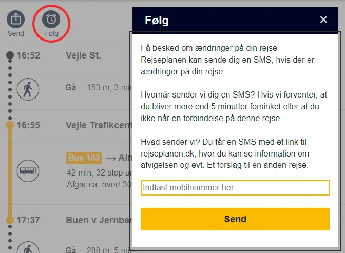 Tilmeld dig Rejseplanens SMS-service og få automatisk besked ved forsinkelser og ændringer på dine ruter. Alt du behøver gøre er at klikke på "Følg", når du søger din rejse. Så får du automatisk besked direkte på din mobil.