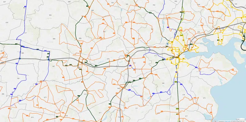 Sydtrafik Map er et digitalt rutekort over alle ruter i Sydjylland. I kortet kan du blandt andet få overblik over ruter og takstgrænser. Bemærk der kan zoomes og klikkes i kortet for flere detaljer.