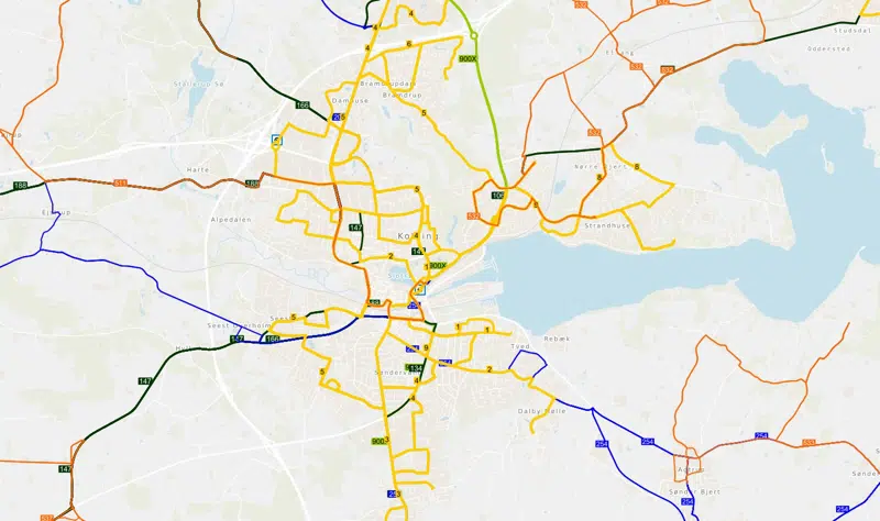 Overblikskort over Sydtrafiks ruter