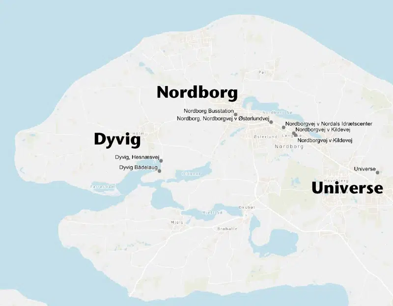 Bussen kører på ruten Dyvig - Nordborg - Universe, så sejlerfolket der lægger til ved Dyvig Badehotel, kan komme ud at opleve dejlige Nordals og Universe.