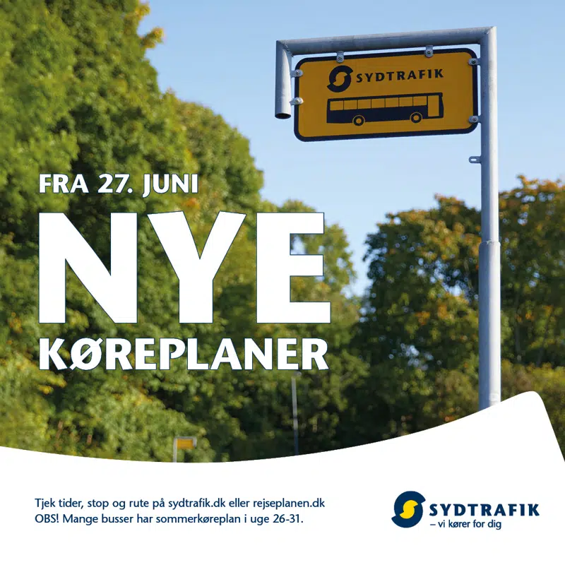 Søndag d. 27. juni er skiftedag for alle Sydtrafiks køreplaner. De fleste køreplaner har dog kun mindre ændringer, men enkelte steder sker der større ændringer på ruter, der bliver sammenlagt eller får et ændret ruteforløb.